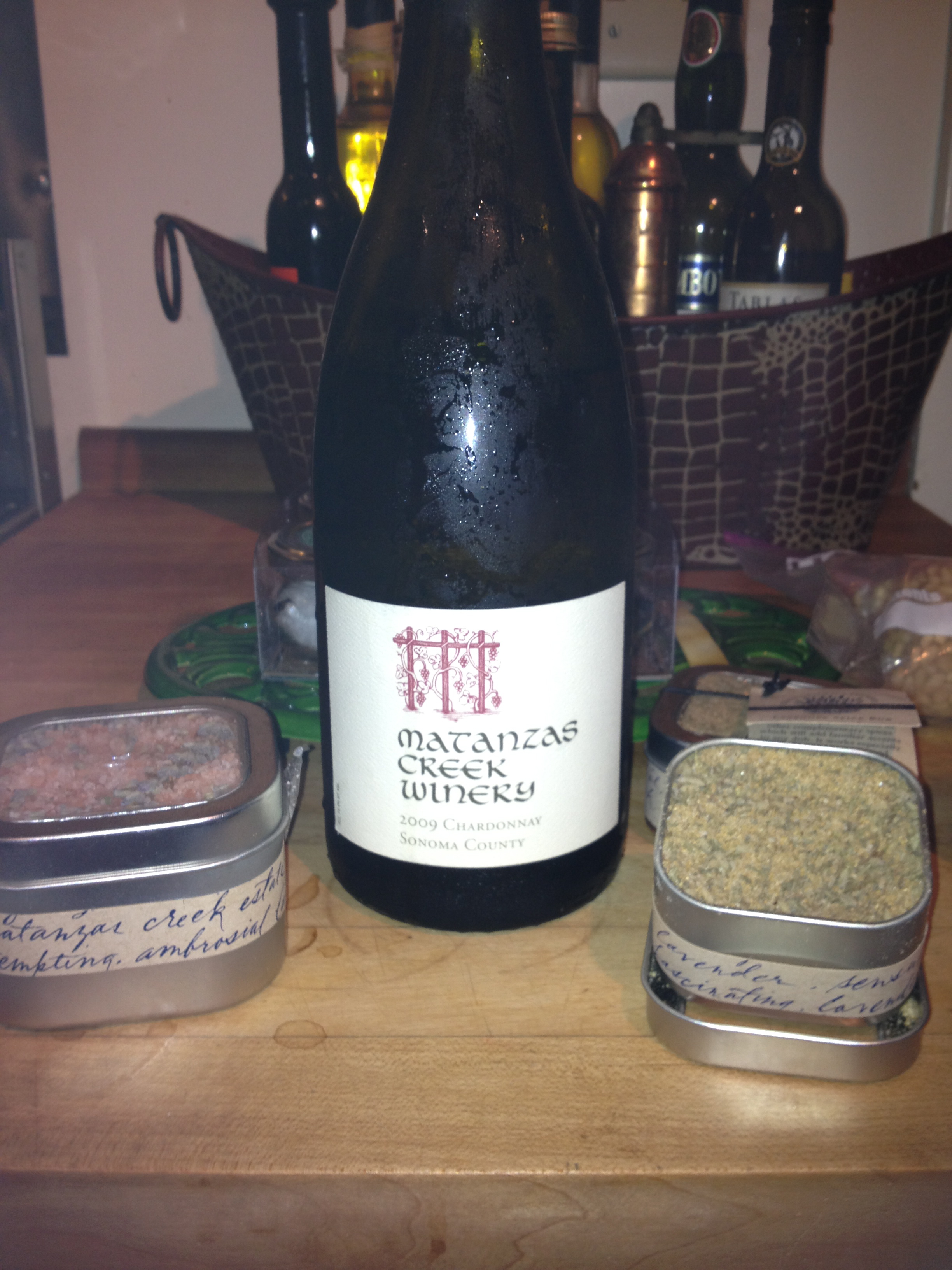 Lavender Spice Rub, Himalayan Salt with Lavender, and a chilled bottled of Matanzas Creek Chardonnay.
